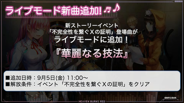 新イベント『不完全性を繋ぐXの証明』に登場するShe is Legendの新曲「華麗なる技法」がライブモードに追加されます。