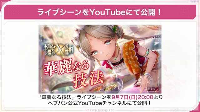 9月7日からヘブバン公式YouTubeチャンネルの方で「華麗なる技法」のライブシーンも公開されます。